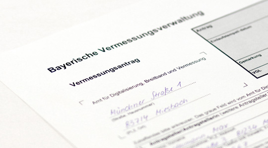 Der Vermessungsantrag für eine Grundstücksvermessung (Grenzvermessung, Grundstücksteilung) kann online ausgefüllt und anschließend ausgedruckt werden. Den ausgefüllten und unterzeichneten Antrag senden Sie an das zuständige Amt für Digitalisierung, Breitband und Vermessung.